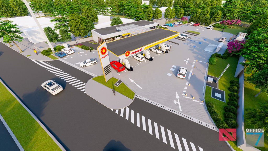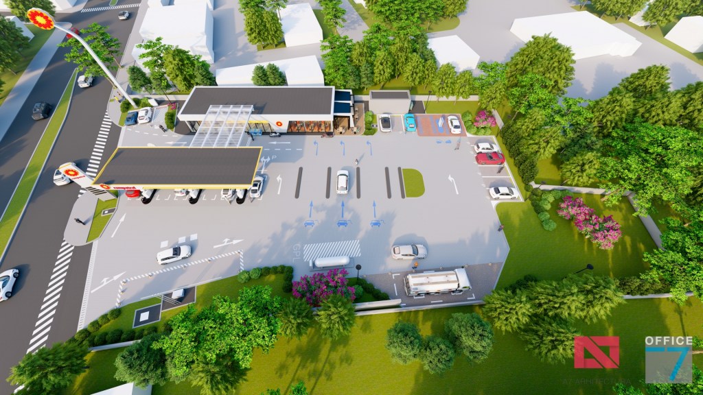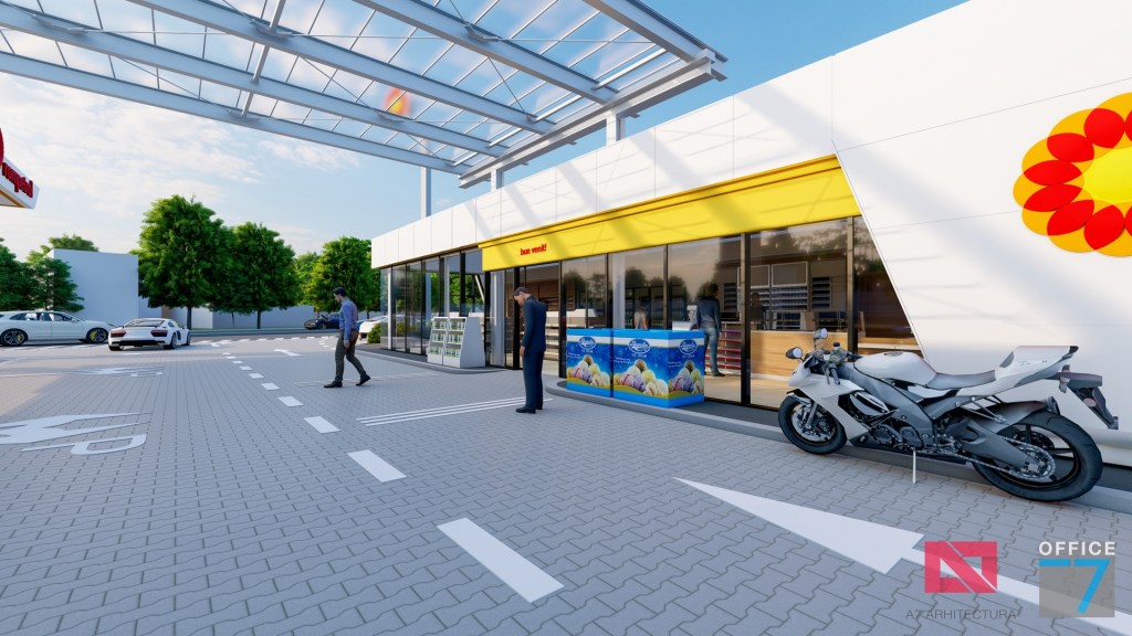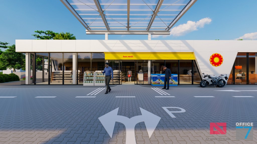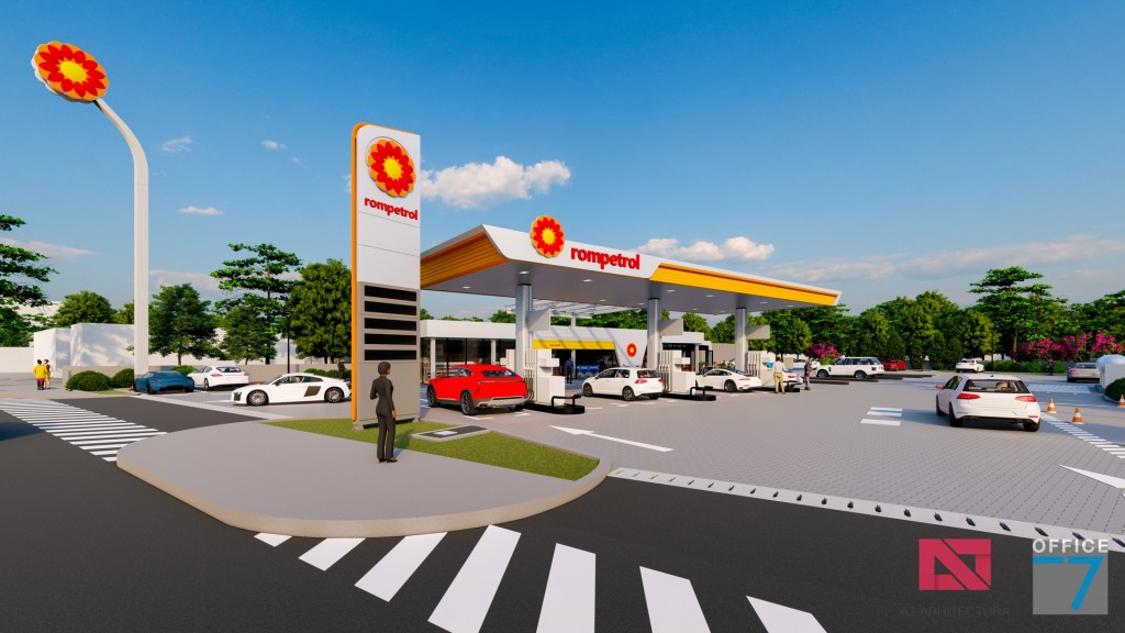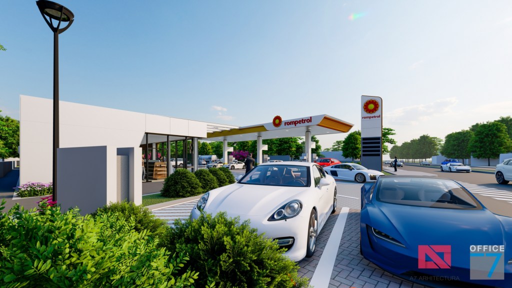 Statie distributie carburanti Rompetrol Craiova pe bulevardul Romanescu si spalatorie auto manuala, concept si proiectare completa.