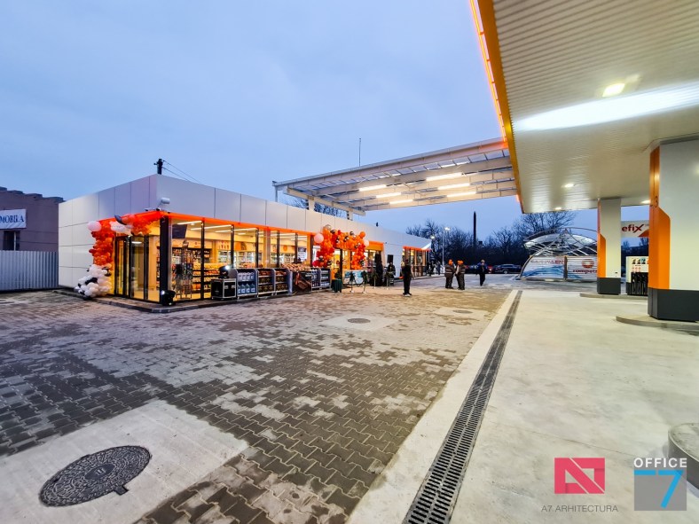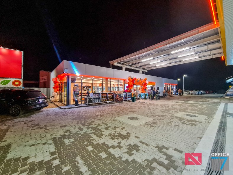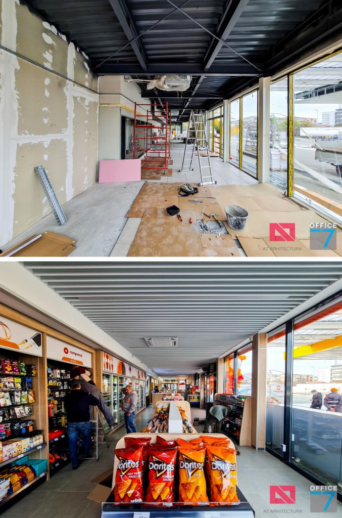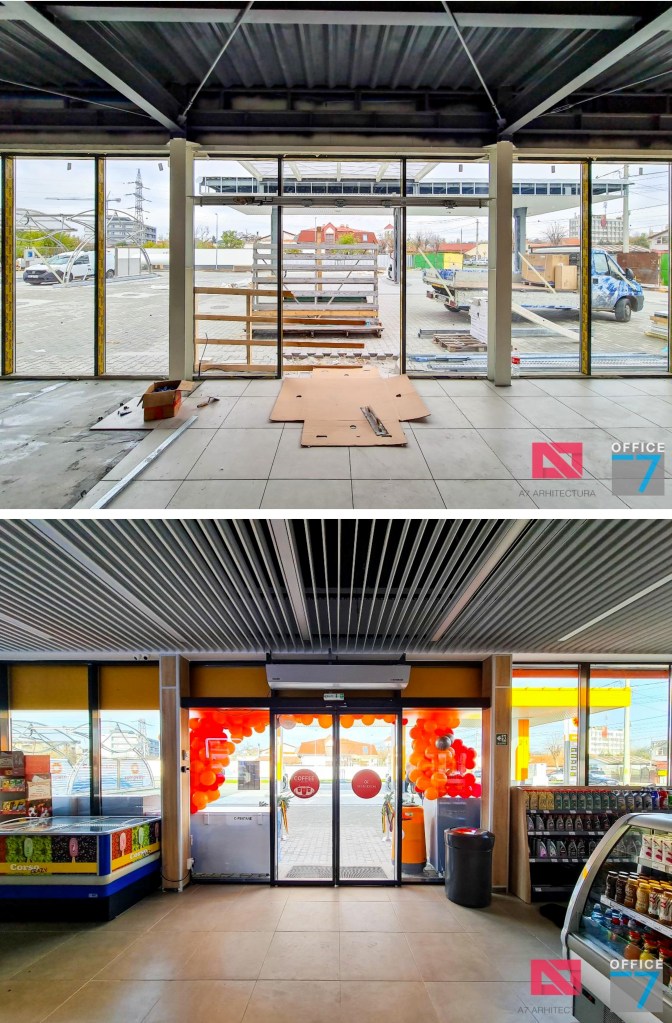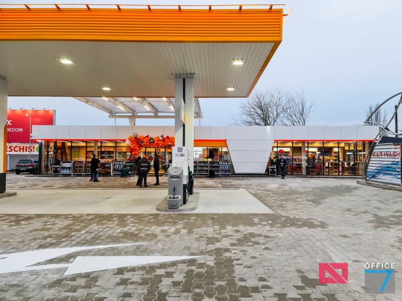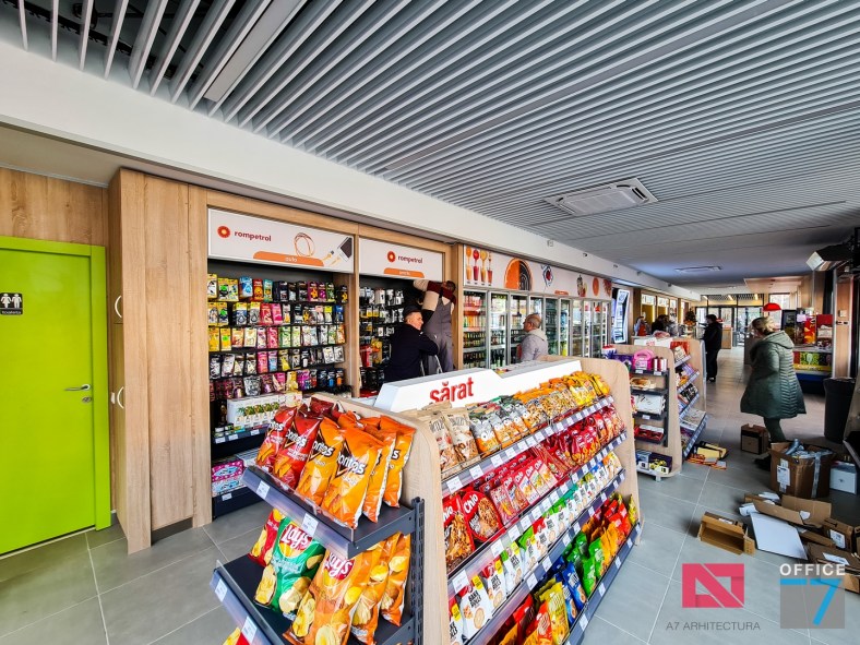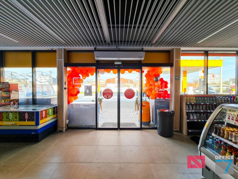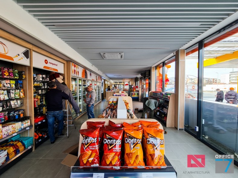 Design Interior si Amenajare Interioara Statie distributie carburanti Rompetrol Romanescu Craiova, situatie pe Bulevardul Nicolae Romanescu numarul 80. Concept proiect 3D, design exterior si interior, Proiectare completa arhitectura – structura – instalatii – tehnologie – platforme si drumuri, avizare, autorizare, urmarire executie si pm. Benzinaria este compusa din: cladirea spatiului comercial + restaurant, copertina cu pompe distributie carburanti, spalatorie auto manuala cu 3 boxe, locuri de parcare si servicii.