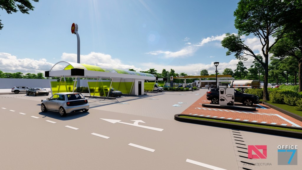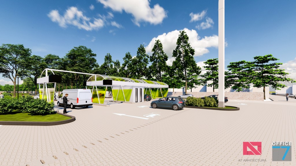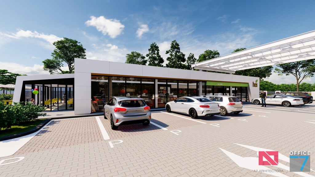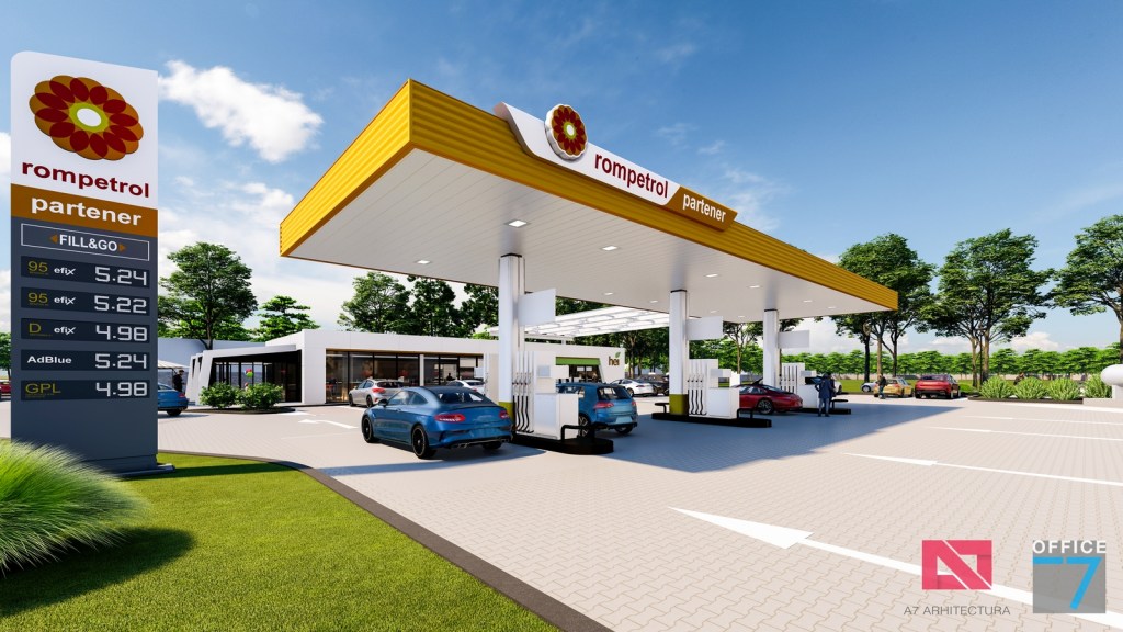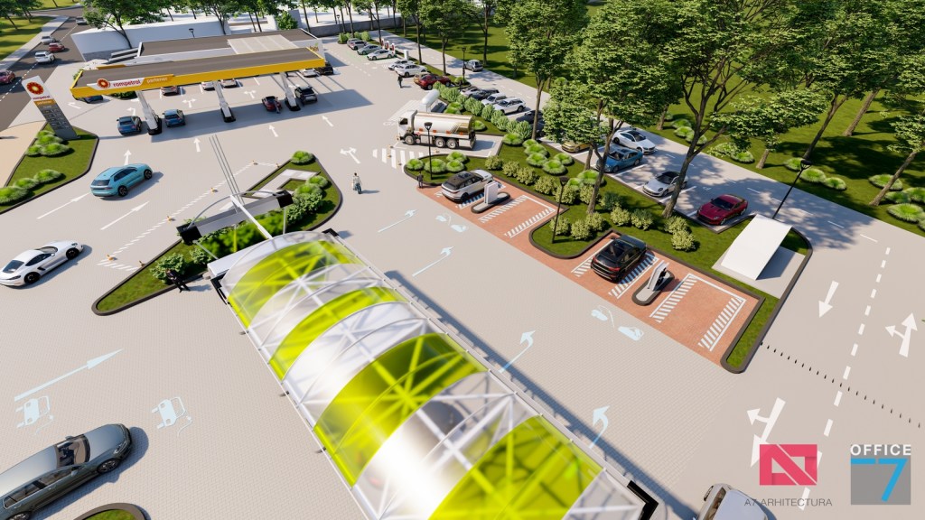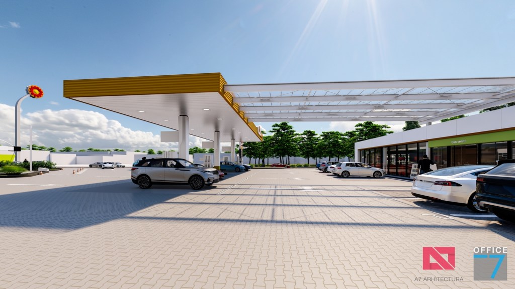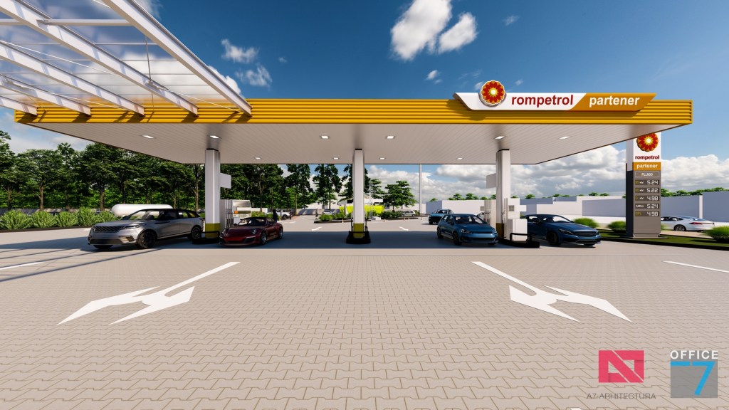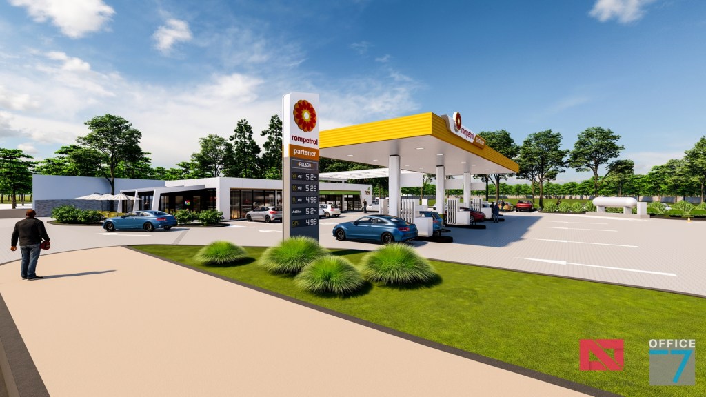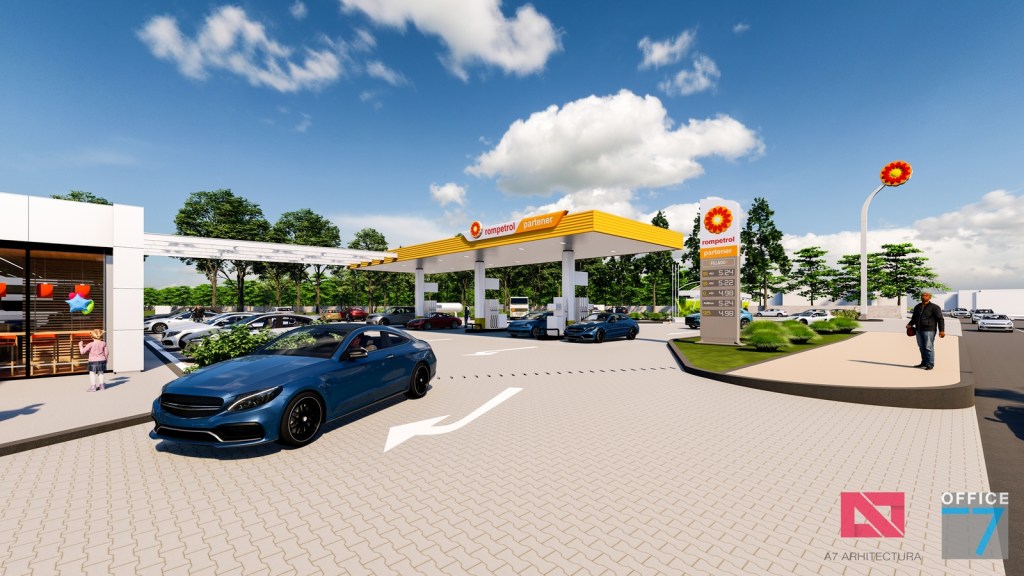 Statie distributie carburanti Rompetrol Podari, Craiova, restaurant, cafenea, cu spalatorie auto, locuri parcare pentru incarcare auto electrice. concept 3.