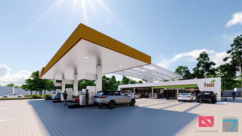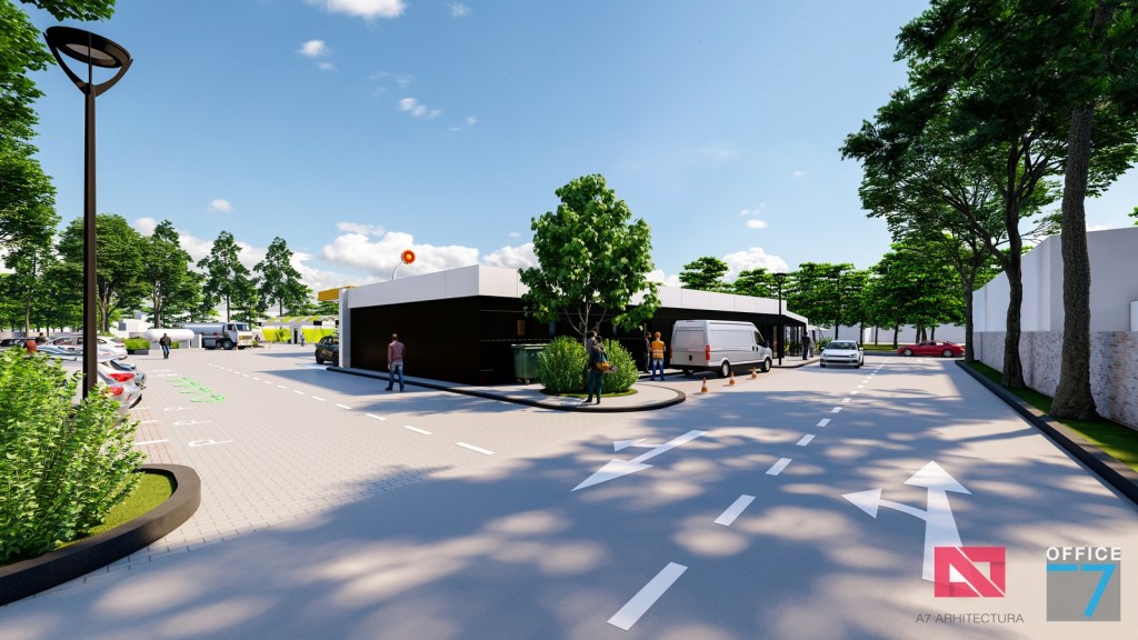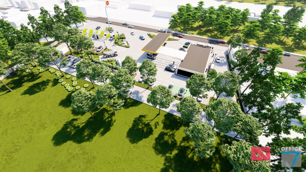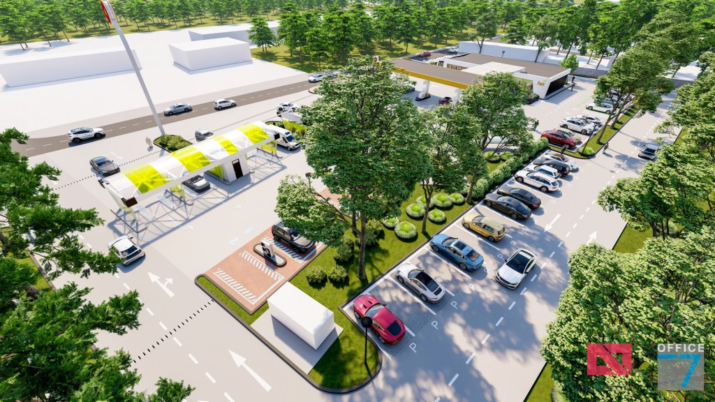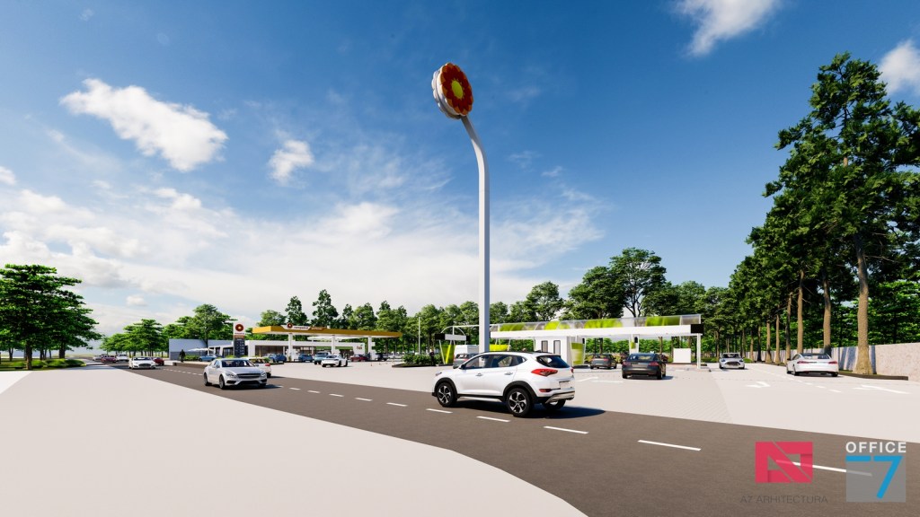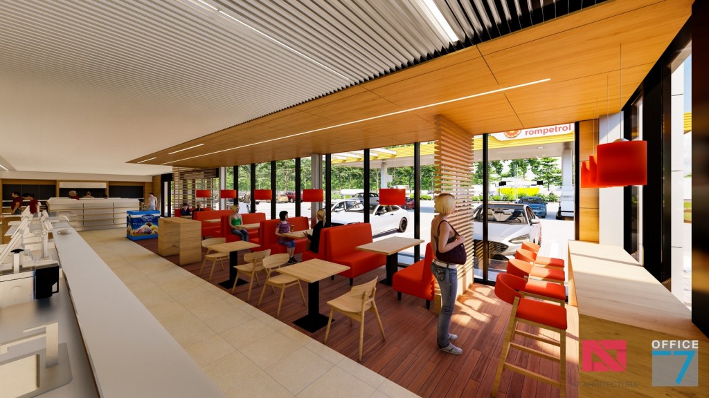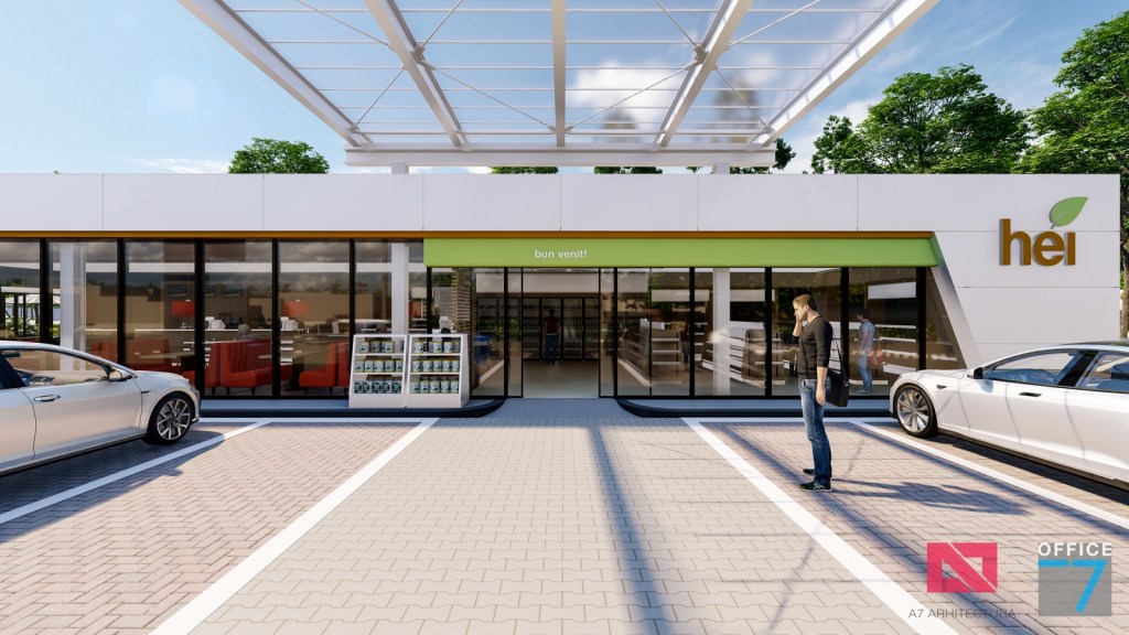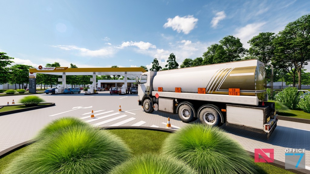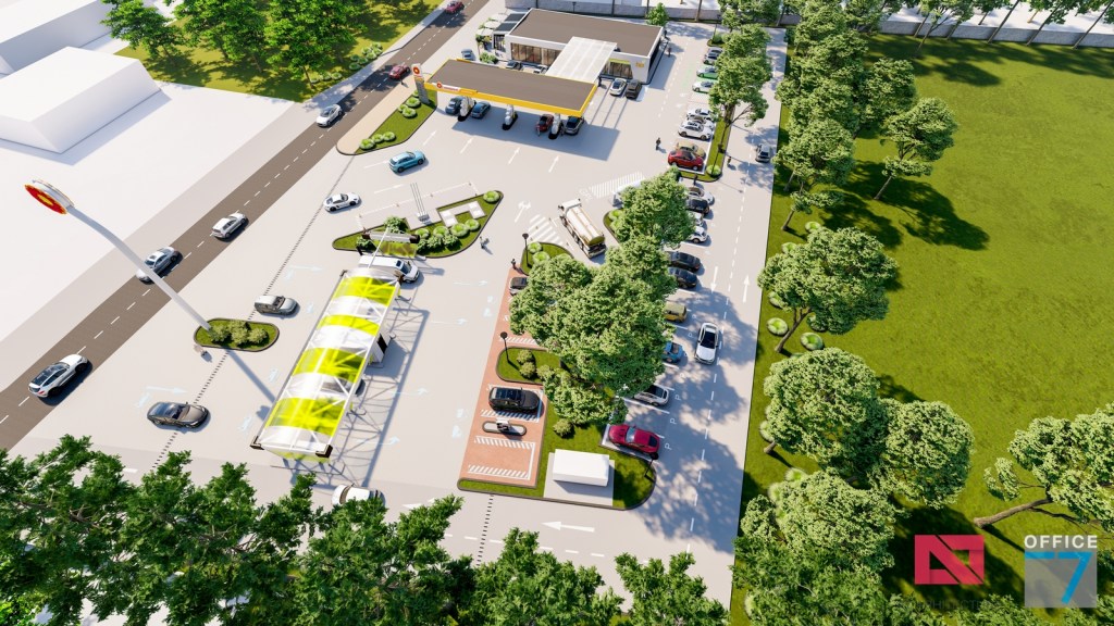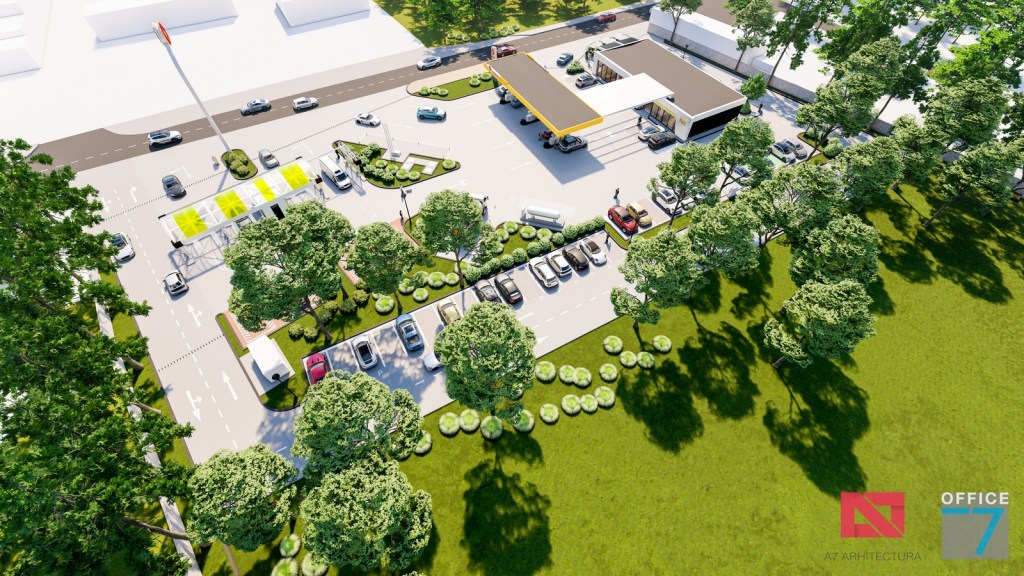 Statie distributie carburanti Rompetrol Podari, Craiova, restaurant, cafenea, cu spalatorie auto, locuri parcare pentru incarcare auto electrice. concept 3.