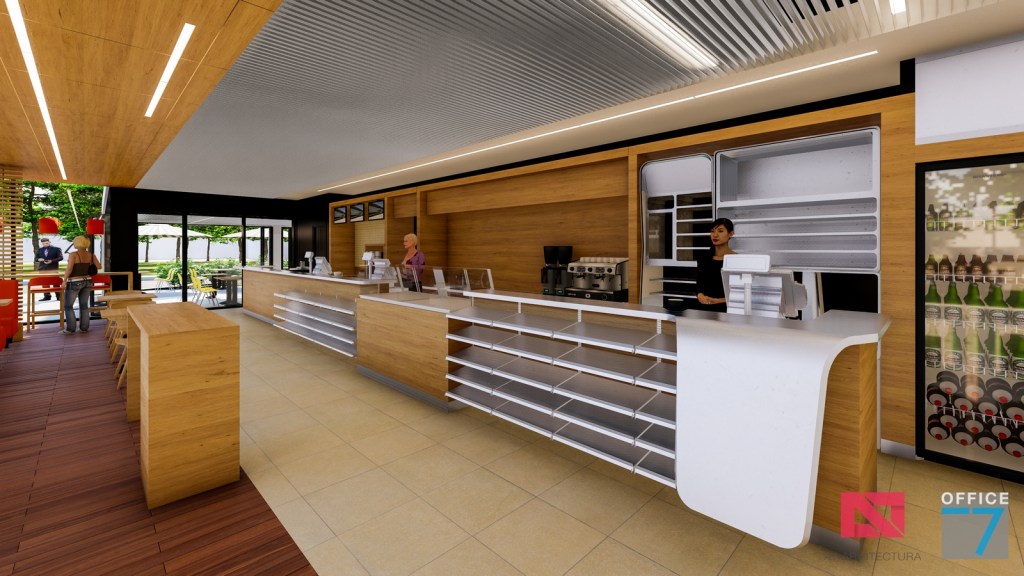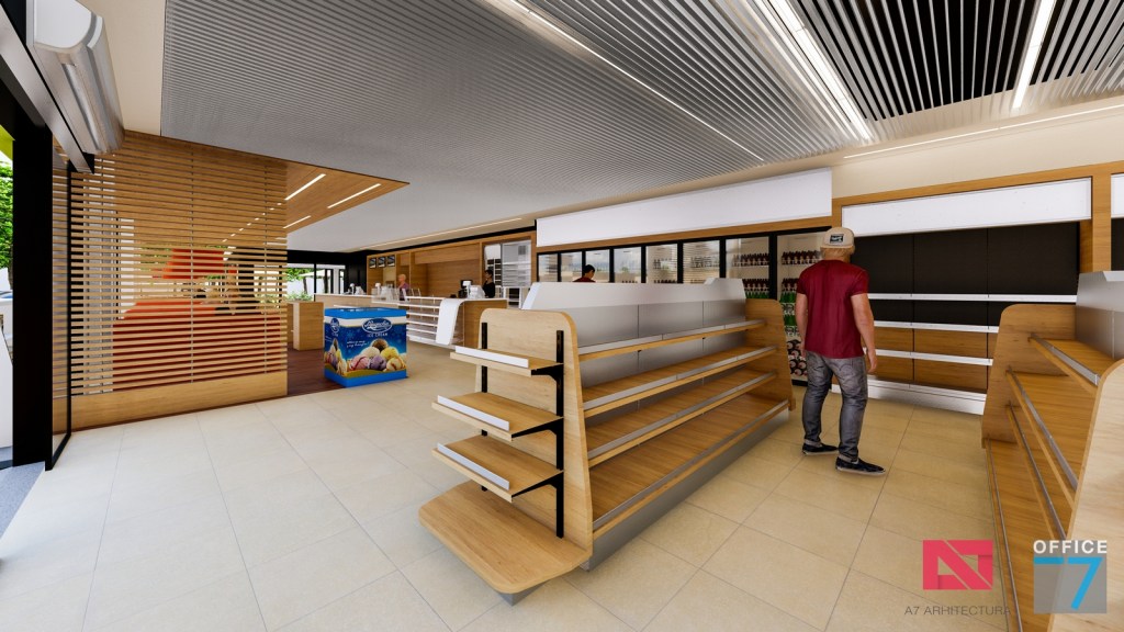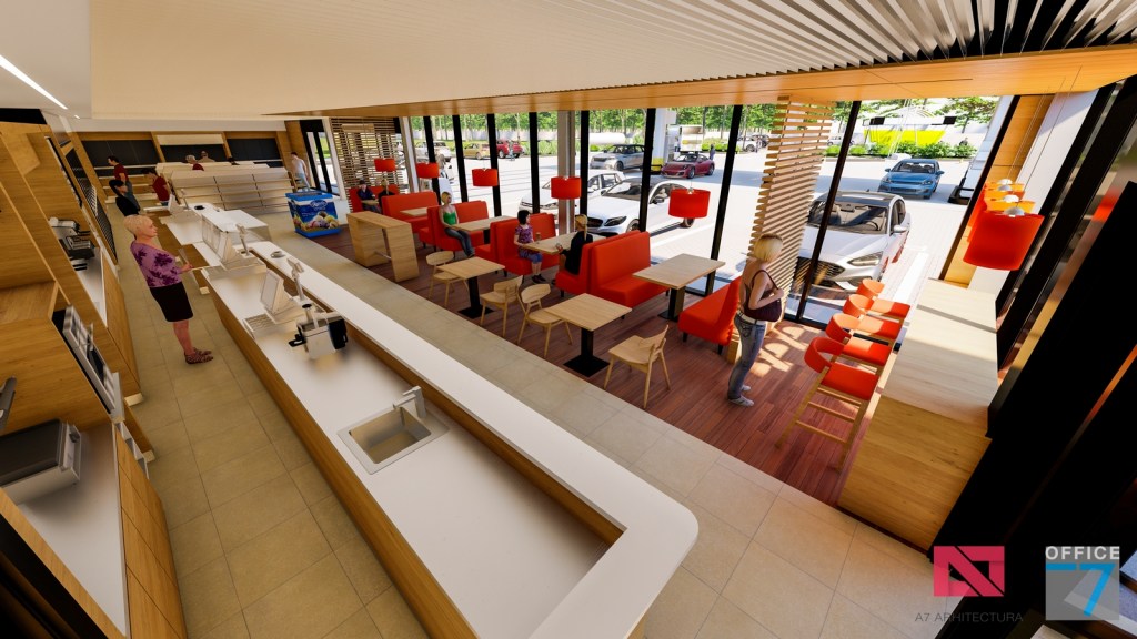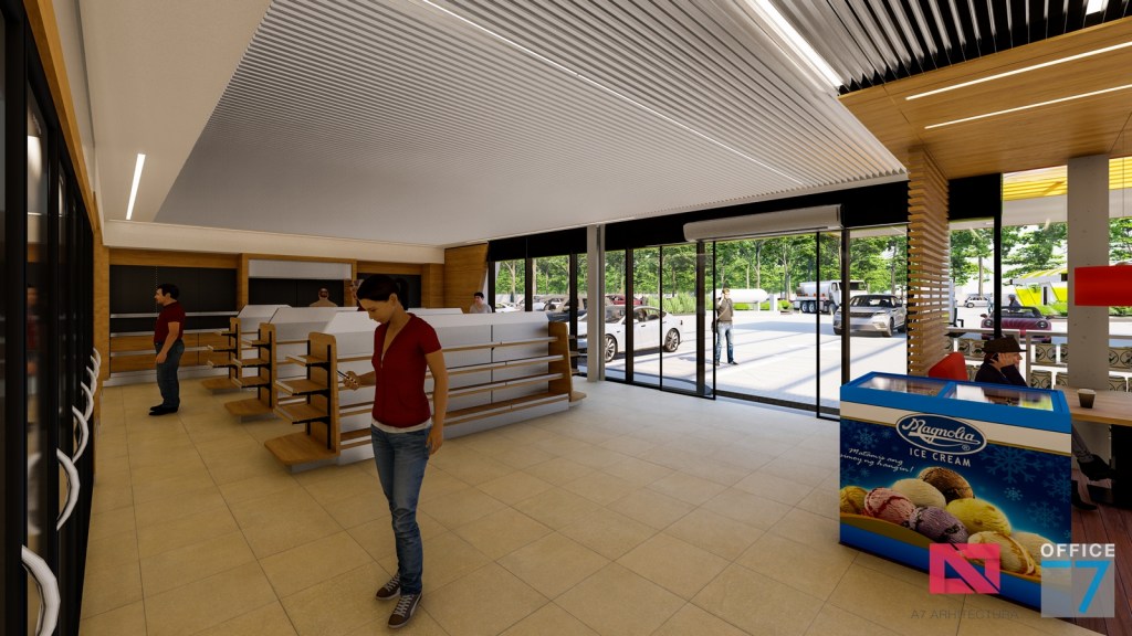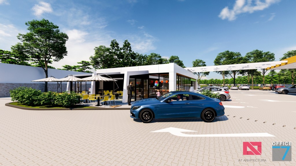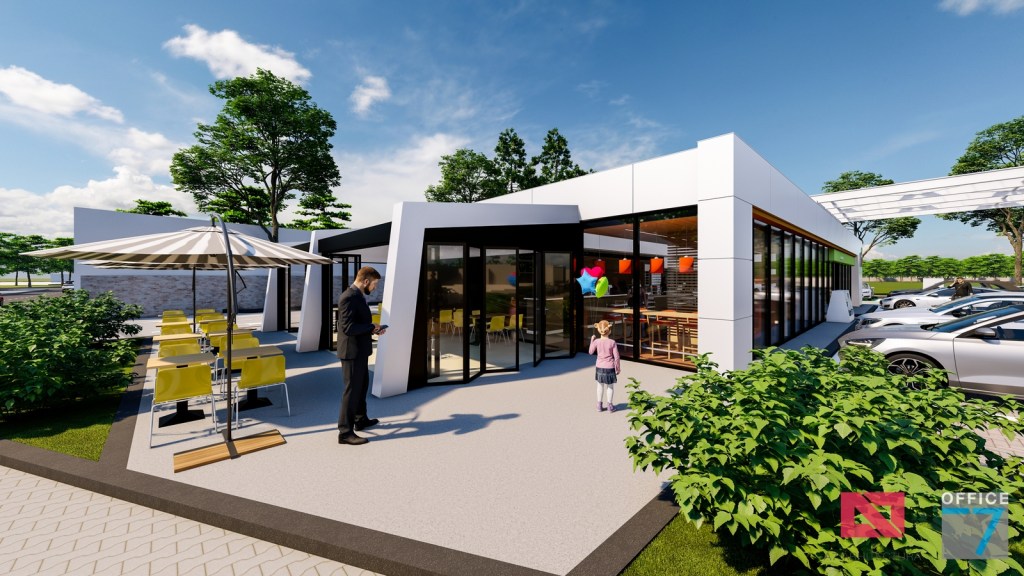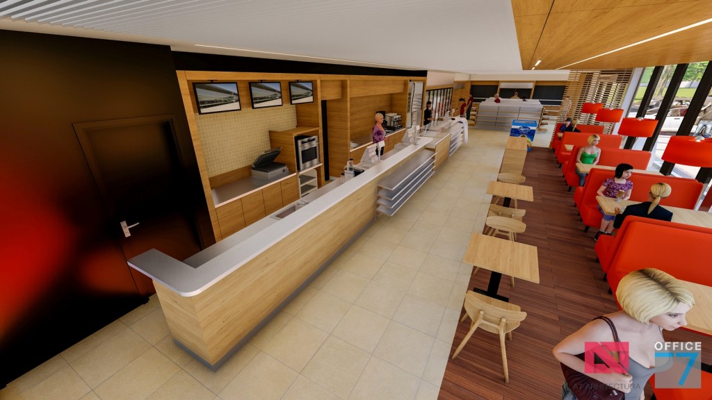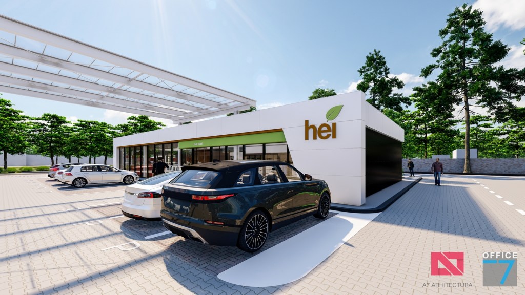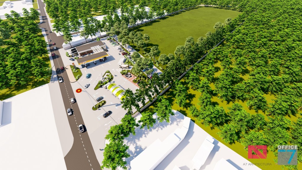Statie distributie carburanti Rompetrol Podari, Craiova, restaurant, cafenea, cu spalatorie auto, locuri parcare pentru incarcare auto electrice. concept 3.